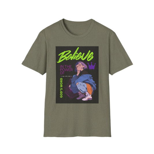 Believe Anime Girl Unisex Softstyle T-Shirt, Faith Graphic Tee, Inspirational Shirt, Gift for Anime Lovers, Japanese Style Top